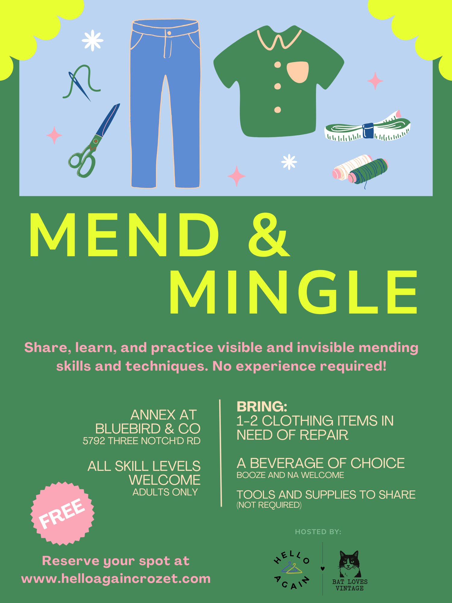 Share, learn, and practice visible and invisible mending skills and techniques. No experience required! Adults only. Free.